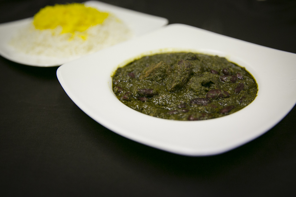 The main ingredients are a mixture of sauteed herbs, consisting mainly of parsley, leeks or green onions, and coriander, seasoned with the key spice of dried fenugreek leaves. The herb mixture has many variations; any dark bitter green can be used, such as kale, mustard greens, turnip greens, etc., although none are part of the original recipe. This mixture is cooked with kidney beans or yellow split-peas, yellow or red onions, black lime (pierced dried limu-Omani Persian lime), and turmeric-seasoned lamb or beef. The dish is then served with chelow (Persian parboiled and steamed rice) or over tahdig.